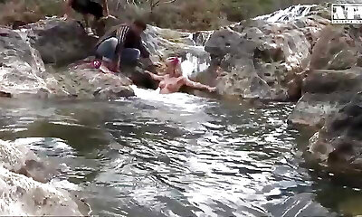 Light haired steaming tramp attacked long fuck-stick of freaky dude right on stone riverbank